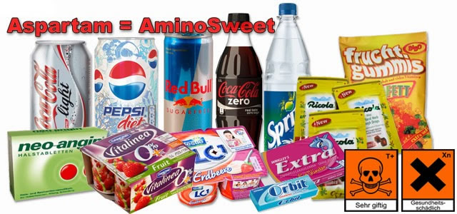 O aspartame é encontrado na Diet Coke e em outros refrigerantes diet. A mensagem a seguir é uma enfática recomendação para MANTER DISTNCIA de tais produtos. Ao considerar o fato adicional de que a maioria deles vem em latas de alumínio (os ácidos da bebida dissolvem os cátions Al+++ – cf. Mal de Alzheimer), há ainda mais incentivo para jogá-los fora. AVISO! NutraSweet é uma neurotoxina!