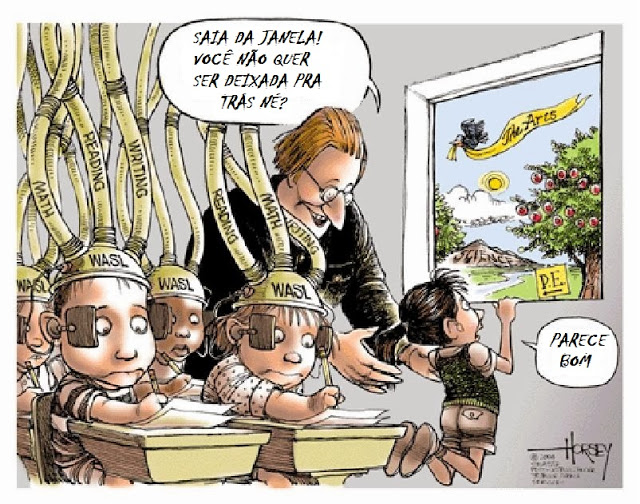 Estudantes são desencorajados a se desviarem de pensar livremente fora dos parâmetros. Eles apenas precisam seguir o currículo que os leva para os testes, para as instituições mais conceituadas e eventualmente se tornarão parte da força de trabalho. Ainda assim a criatividade é seu direito nato. Eles apenas ensinaram a você como desaprender isto sem você nem mesmo perceber.