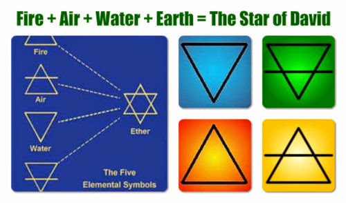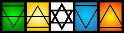 Neste tópico apenas falarei sobre os elementos e o hexagrama. Como os símbolos de cada elemento (água, terra, fogo, ar e éter) se integram no símbolo do hexagrama ou Selo de Salomão ou Estrela de Davi.