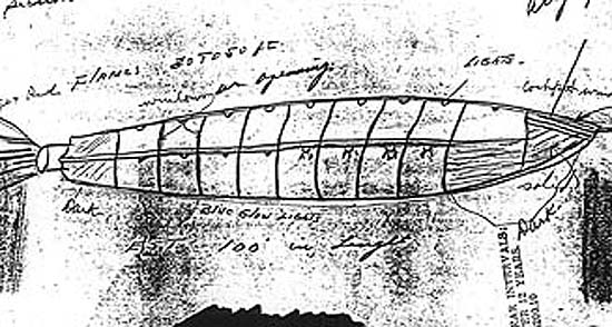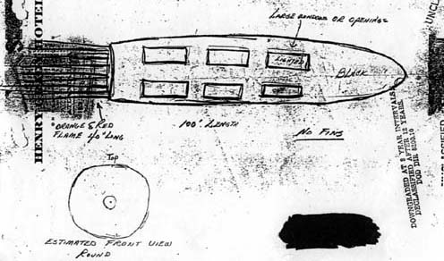 Co-piloto Whit’s sketch para Project SIGN. Diferiu consideravelmente da descrição do piloto. Whitted viu o objeto como um padrão de seis grandes painéis iluminados retangulares arrastados por uma chama vermelha alaranjada. Ele também estimou o comprimento do objeto como 100 pés.